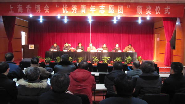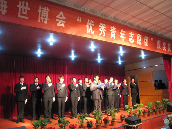 颁奖仪式上,共青团上海世博会主题馆团委负责人宣读了授予我院“优秀青年志愿团”称号的决定,上海绍兴饭店人力资源部经理吴旭东向学院董事长陈孝云颁发了证书及奖杯。