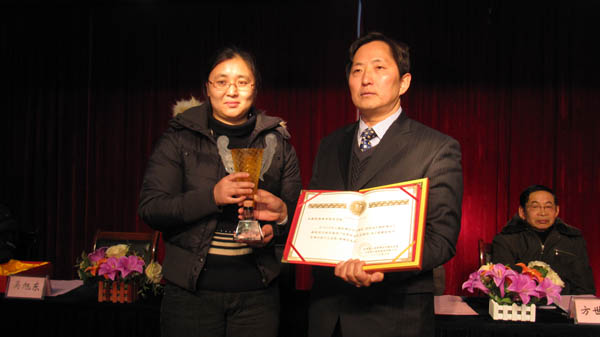 上海绍兴饭店人力资源部经理吴旭东向董事长陈孝云颁发证书和奖杯