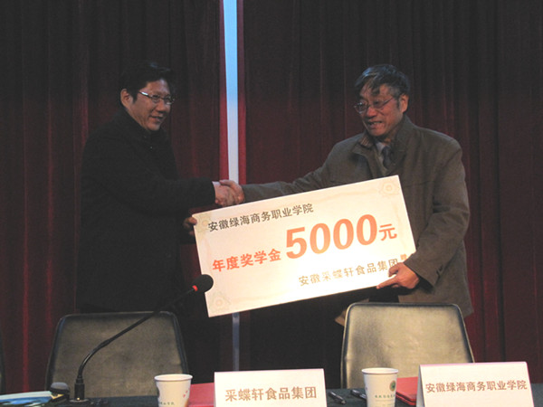 采蝶轩集团总经理朱学令在致辞中强调,企业发展,人才是关键。采蝶轩将以共赢、创新为目标,拉开与安徽绿海商务学院校企合作的帷幕。同时,采蝶轩食品集团为我院特困学子赞助了5000元年度奖学金。