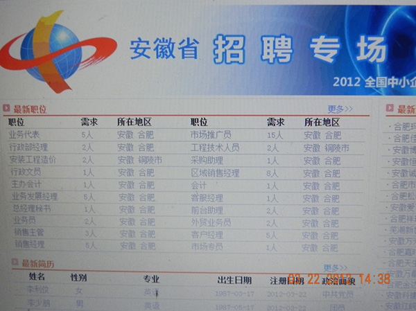 2012年3月22日,为认真贯彻执行皖经信中小企函【2012】183号文件精神文件内容,我院举办了2012届毕业生就业网络招聘会。学院领导对此次招聘会给予了高度重视,同时也对各项前期准备工作和现场实施环节均作了具体要求,使本次活动得以如期、顺利地举行。