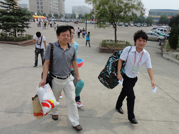 据了解,许多学生干部一天来来回回将近二三十趟,当记者问他们累吗?他们擦了擦脸颊上的汗,微笑着说:“不累,去年我们报到时,学长学姐也是这样服务我们的,今天我们只是在延续这种服务精神,相信等2012届新生报到时,他们依旧会如我们今天一样继续为新生服务。”前来报名的许多新生都亲切地称他们为“白衣天使”。 看着这一张张疲惫的笑脸,记者由衷地对他们表示敬佩,正如横幅上所写“接过你的行囊,我们就是一家人”,是的,在绿海的蓝天下,我们就是一家人!
