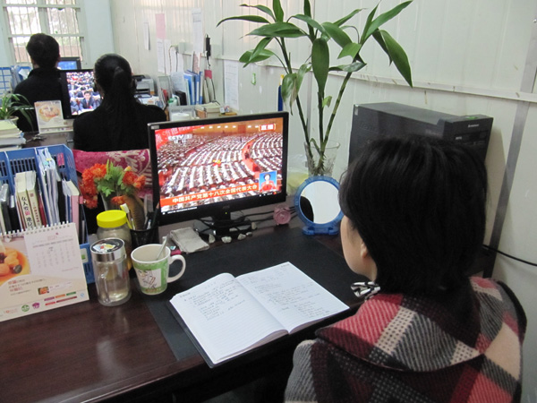根据学院党委的要求和安排,全院各级党组织利用各种形式组织师生观看十八大开幕式的现场直播,聆听胡锦涛总书记代表第十七届委员会做题为《坚定不移沿着特色社会主义道路前进 为全面建成小康社会而奋斗》的工作报告。大家认为报告文字精炼,内容丰富,高瞻远瞩,内涵深刻,有许多新观点、新提法。报告客观实际地回顾总结了十年来特别是十七大以来治党治国的不平凡历程和取得的巨大成就,也实事求是地指出了存在的问题和困难,深刻分析了面临的国际形势和肩负的历史重任。报告描绘了今后五年的改革发展蓝图,指明了治党理政的方向和奋斗目标。一些有课的教师和学生下课后也都迅速参加收看。