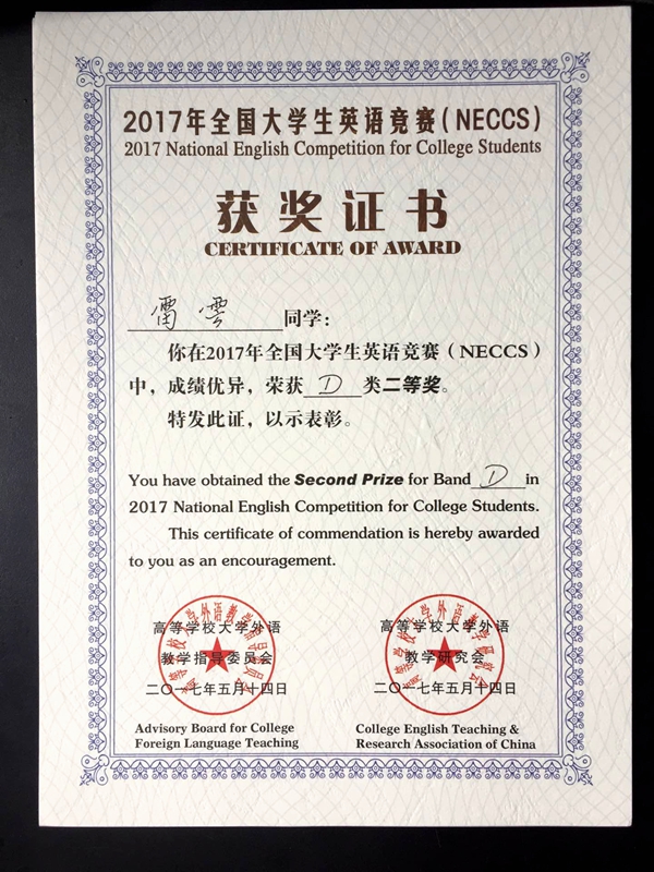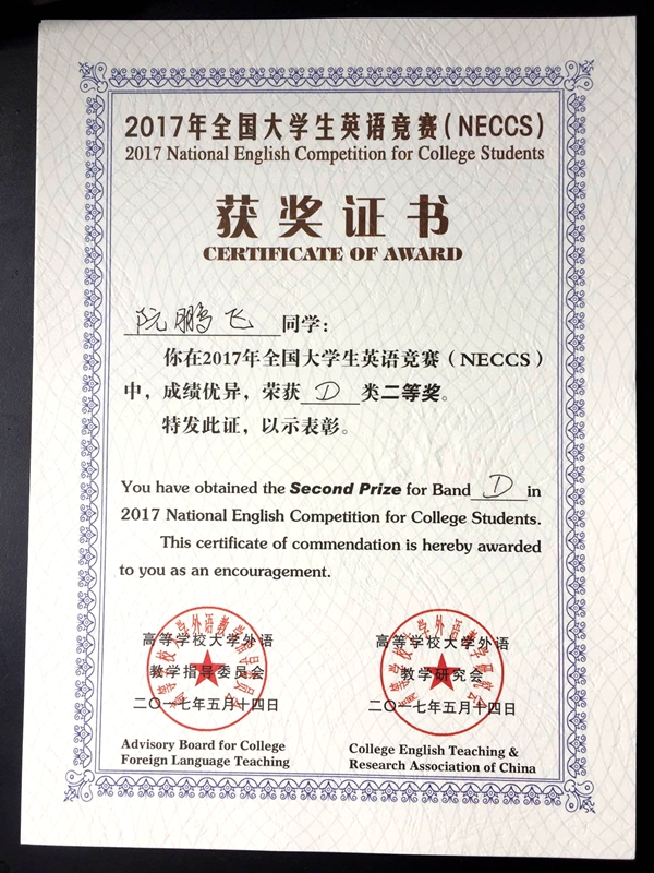 近日,从全国大学生英语竞赛组委会传来喜讯,365集团六名学生获2017年全国大学生英语竞赛(NECCS)D类(高职高专非英语专业学生和艺体类本科生)二、三等奖。