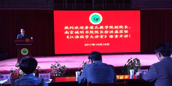 为传承和弘扬中华优秀传统文化,坚持立德树人,10月16日晚,第三期《江淮国学大讲堂》在365集团体育馆隆重开讲。香港孔教学院副院长、南京诚明书院院长徐洪磊为学院千余名师生、部分企业家代表做了一场《平治天下 修身为本》的精彩报告。报告会由学院党委副书记张以亭主持。