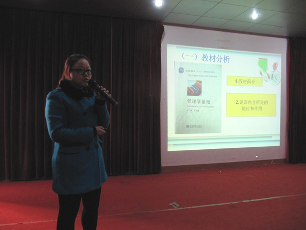 本次比赛是在系部初赛的基础上进行。参赛选手通过说教材、说教发、说学法、说教学程序等方面进行了精彩的说课。评委们结合参赛选手的教育理论水平、实际教学业务能力和教学组织能力逐一打分。最终管理系冉雪娅获得一等奖;外语系吴卉子、经贸系刘红娟获得二等奖;信息系周洁、基础部张洁获得三等奖。