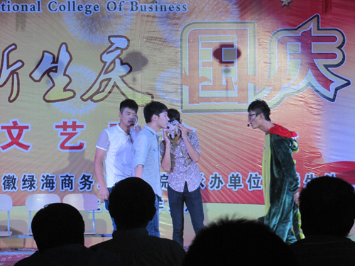 一支动感的开场舞正式拉开了文艺晚会的序幕。在金色的灯光下,舞者们散发着无限的活力与热情。随后,大一新生一曲《小酒窝》情感质朴感人,现场顿时充满了温馨的气氛。创意T台秀以时尚的步伐和动听的旋律,使大家领略到了青春的别样色彩。魅力四射的舞台上,老师们也不甘示弱,一首诗朗诵《沁园春》道出了无数中华儿女对祖国真挚的爱。现场节目精彩不断,高潮迭起。整台晚会最具特色的节目来自于经贸系黄亮亮和曹俊涛展示的《穷二代与富二代》,演员们诙谐的语言,夸张的动作,恰到好处的舞台表演力,将台下的观众一次次逗得捧腹大笑。经贸系段梦强表演的吉他弹唱《平凡之路》,歌声中透着绿海学子的自信和对未来的无限憧憬!