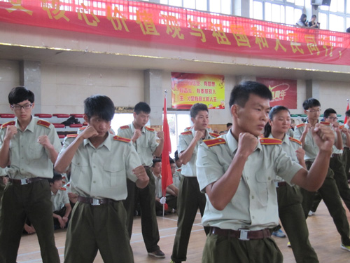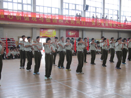 军训汇演中,各方队依次精神抖擞地通过主席台。分列式开始,各方阵步伐矫健、士气昂扬。一连队列示范表演整齐划一;六连、九连分别带来了精彩的集体舞《浪漫樱花》、《向前冲》;五连带来了擒敌拳表演,刚健有力。同学们以昂扬的斗志、矫捷的身姿、整齐的动作及气势如虹的呐喊,展示了“90后”大学生奋发向上的精神风貌和朝气蓬勃的青春气息,赢得了全场师生热烈的掌声。