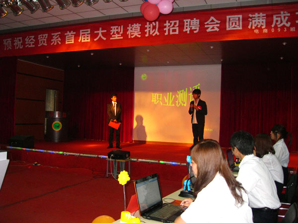 6月1日晚,经贸系大型模拟招聘会在学院学术报告厅隆重举行,副院长计承光、董办秘书王炯、学生处副处长杨超、经贸系副主任戴昭慰、副书记唐义林等领导参加了此次活动。