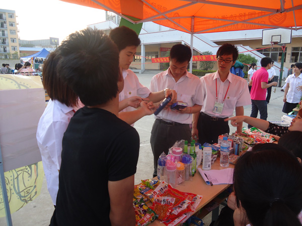 大赛现场,每一组参赛人员都把自己的展台设计成不同的风格,展台上摆放着同学们密切相关的商品。在课间,很多同学到大赛现场观看和购买商品,短短几分钟篮球场便成了一条热闹的商业街。晚上,在朦胧的灯光下,同学们的身影在不同的展台中穿梭,营造了商业市场的夜市氛围。