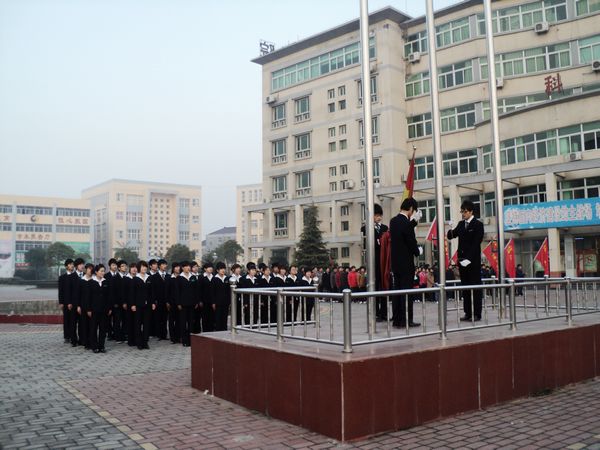 仪式现场,国旗手和国旗方队身着校服,迈着整齐的步伐走向国旗台,在响亮的国歌声中,鲜艳的五星红旗映着朝霞冉冉升起。市场营销101班全体同学铿锵有力的学生宣言向我们昭示着绿海学子励志成才的目标和决心。