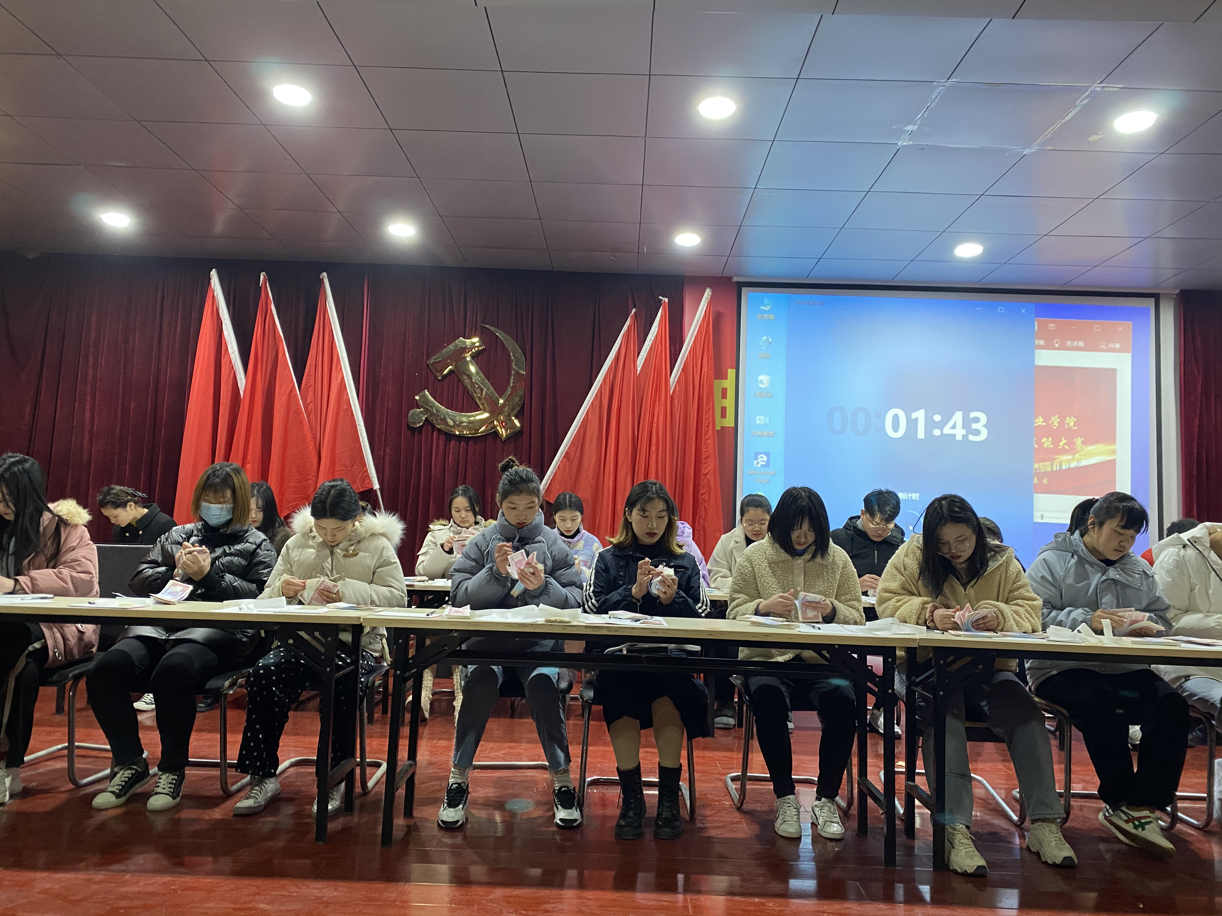 本次比赛分为两个环节,点钞展示与填制会计凭证,评判标准为选手在规定的时间内谁完成的最多,目的在于考查同学们的专业实践基础是否稳固。比赛开始,同学们都迅速地进入状态开始操作,首先是飞快地点钞,同学们都用各自习惯地方式进行点钞,有用单指有用多指或者其他方式,紧接着是结合竞赛试题,将会计凭证完整快速地出具出来。比赛现场,选手们心无旁骛、高度专心,争分夺秒却又有条不紊,他们用实力印证了学院会计人的能力与风采。评委老师们高度负责的精神也深深地激励着每个选手和在场观赛的人。