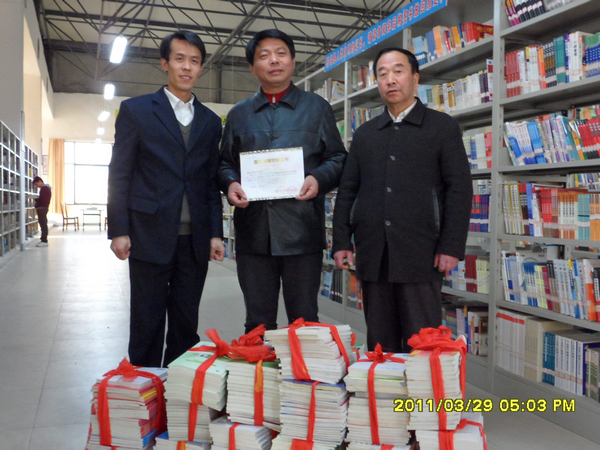 经贸副主任戴昭慰、党总支副书记唐义林与图书馆长季修栓在捐赠现场