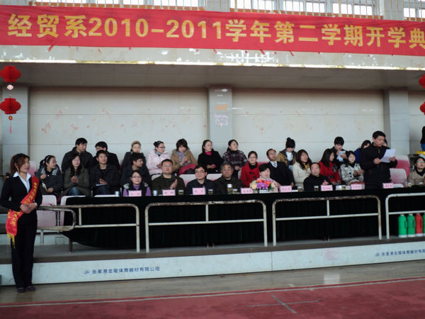 3月8日中午,经贸系新学期开学典礼在体育馆二楼隆重举行。院长蒋玉珉,学生处副处长杨超等领导及经贸系全体师生参加了典礼。经贸系党委书记唐义林主持典礼。