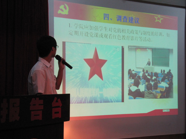 2011年6月10日下午15:30,庆祝建党90周年暨“绿海学子,青春报告” 校园问卷调查报告决赛评选活动在学院报告厅举行,省教育厅派驻我院督导专员、院党委第一书记陈钦、党委书记方世权、常务副院长丁元生等相关院系处室领导莅临指导。思想政治理论课教学部所有成员参加。思想政治理论课教学部胡主任首先对本次活动开展的背景、目的、过程、意义等进行了详细的介绍。