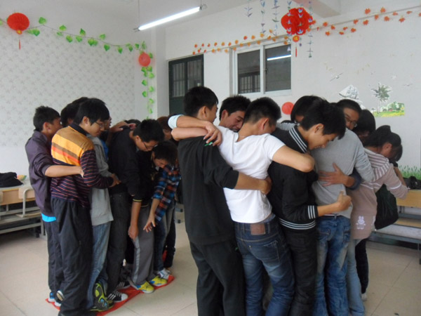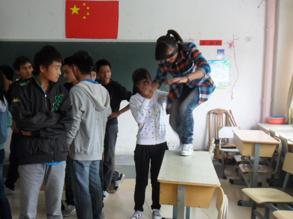 此次心理辅导由陕西师范大学心理学专业的硕士研究生黄凤老师策划主持。通过精心安排,同学们在短暂的热身游戏后分别进行了“盲行”和“翻树叶”两个团队合作游戏。在“盲行”游戏中,团体成员两人一组,一位做盲人,一位做帮助盲人的人,盲人蒙上眼睛,原地转3圈,暂时失去方向感,然后在帮助人的搀扶下,沿着指导者选定的路线活动,其间不能讲话,只能用手势、动作帮助“盲人”体验各种感觉。在“翻树叶”游戏中,12人一组,站在既定大小的“树叶”上,想办法将树叶翻过来。