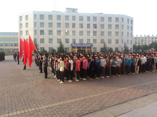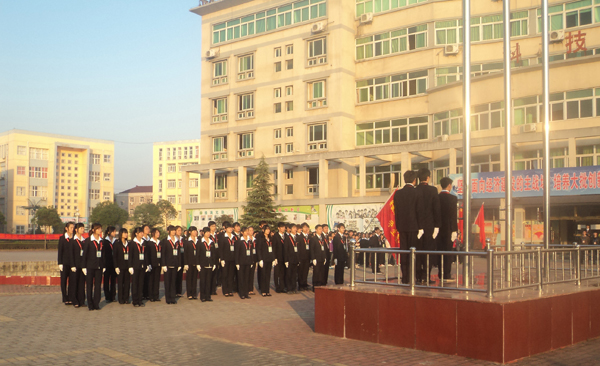 由系学生会组成的国旗护卫队,昂首挺胸迈着铿锵有力的步伐缓缓走来,静候在两旁的同学们凝望着鲜艳的五星红旗,敬意油然而生,整个广场显的庄严而肃穆。