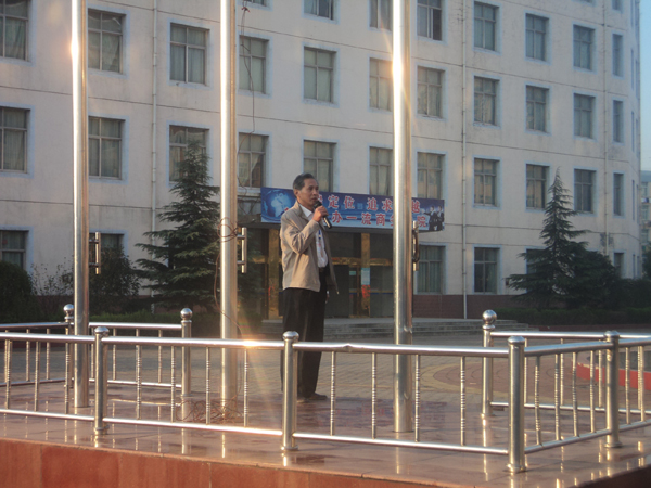 升旗后,由系学生会副主席武莎莎带领全体大一同学宣誓。接下来邢江淮副主任发表讲话,他宣读了《关于通报表扬李刚同学见义勇为先进事迹的决定》文件,倡导同学们向李刚学习,团结一致创建绿海平安校园!