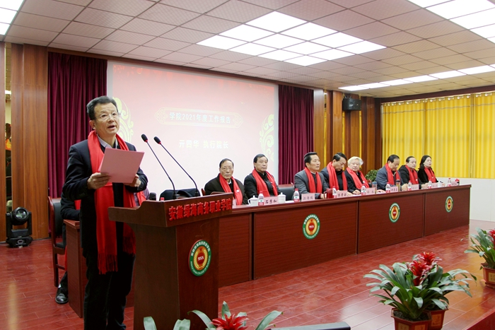 会上,亓四华作2021年度学院工作报告。他指出,2021年是学院全面深化教育综合改革、全力推进转型发展的攻坚之年,全院师生员工深入学习贯彻习近平新时代中国特色社会主义思想和党的十九大精神,凝心聚力、开拓创新,各项事业不断取得新突破、呈现新气象。报告分别从党建引领焕发新气象,“三全育人”取得新成效,人才培养水平迈上新台阶,学生教育管理开创新局面,师资队伍建设再上新水平,招生就业取得新突破,新闻宣传展现新作为,文化育人凝聚新力量,综合服务保障呈现新面貌等九个方面,全面回顾了2021年的工作成绩。