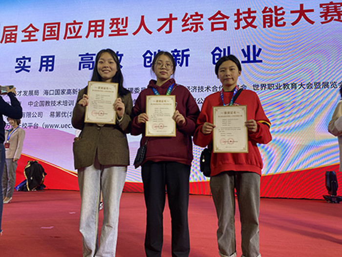 第五届全国应用型人才综合技能大赛是由国际经济技术合作促进会、海口市人民政府、文化产业促进会、世界职业教育大会联合全国应用型人才综合大赛组委会共同举办的级大型赛事。本次大赛有来自全国31个省、自治区、直辖市的1100余所学校、15000多支队伍报名参赛,上百家知名企业负责人参与。经过激烈角逐,朱林、赵呈颖同学获得“匠心·职场秀”简历精英挑战大赛全国赛项二等奖,王亚茹同学获得“奋斗新时代·光山杯”短视频大赛全国赛项二等奖。