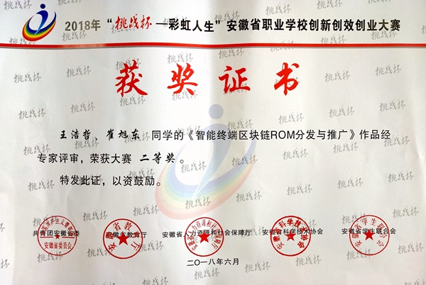 近日,由团省委、省教育厅、省人力资源和社会保障厅、省科协、省学联联合举办的2018年“挑战杯——彩虹人生”安徽省职业学校创新创效创业大赛在安徽滁州职业技术学院拉下帷幕。365集团推报王浩哲、崔旭东两位同学的《智能终端区块链ROM分发与推广》经一对一答辩、专家评审,荣获大赛二等奖。