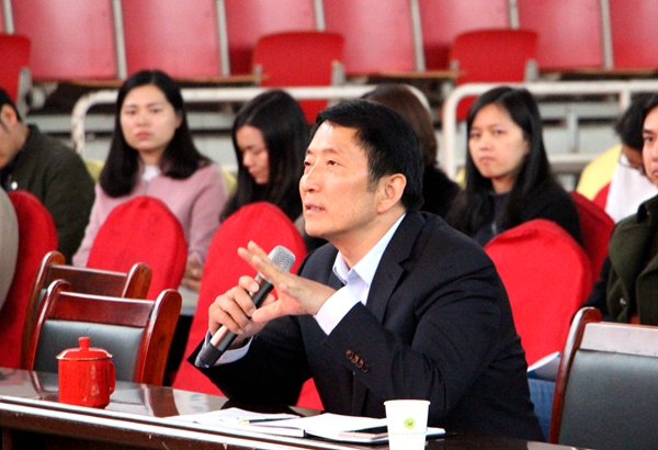 紧接着,希斯乐结合自身办学经历及德国职业教育发展史作一场涉域广泛、内涵丰富的专题讲座。希斯乐详细介绍了德国职业教育的历史、现状与趋势,尤其提到工商大会在德国职业教育发展的重要地位,分析了、企业、工会、学校对德国“双轨制”教育发展的推动和贡献。讲座之后,希斯乐与绿海学院领导、教师代表重点讨论了如何引进德国“双元制”理念、德国职业教育中的企业培训是如何开展的、中德职业教育的未来发展和合作模式等问题。整场报告会融国际合作、历史经济、文化教育、政治外交等内容为一体,聚焦德国职业教育发展的成果和成功之道,大家纷纷表示大开眼界、深受启发、受益匪浅。