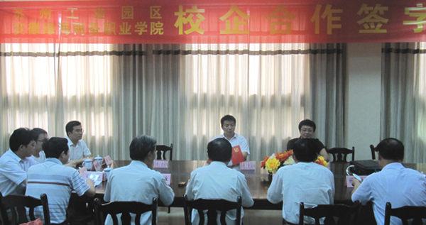 会上,苏州工业园区有关负责同志做了热情洋溢的讲话,表示非常愿意与我院建立长期校企合作关系,并希望就产学研基地、实习基地建设及公司员工培训等进行全方位合作。学院党委书记方世权首先对苏州工业园区对我院人才培养的支持表示了感谢,希望在互惠互利、双方共赢的原则下,双方的合作定会更加圆满。最后,双方领导签订了协议、挂牌并合影留念。